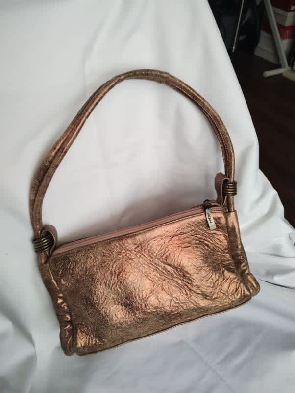 Estilo clutch pero con una onda más moderna, con asas de un largo ideal para llevar al hombro o en la mano. Ideal para ocasiones en que se debe lucir más chic. Cuero con acabado metalizado tornasol que, según la luz, cambia de dorado a cobre, forro interno de tela. Con dos compartimentos: uno con bolsillo interno plaqué y cadena para llaves, y otro con bolsillo interno con cierre; bolsillo externo posterior con cierre. Medidas: el cuerpo mide 17 cms de alto, 28 cms de ancho, profundidad (fuelle lateral) en la base 10 cms y en la parte superior 4 cms., asas de 54 cms de largo de extremo a extremo.