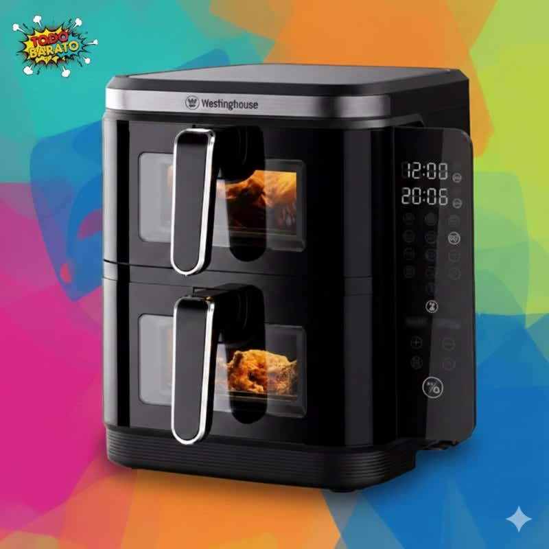 NUEVO INGRESO!‼️ Freidora de Aire Westinghouse 12L Digital CARACTERISTICAS: Capacidad doble (12 L total): 2 canastas independientes de 5,9 L, perfectas para cocinar distintos alimentos a la vez. Alta potencia — 2200 W: acelera los tiempos de cocción y permite alcanzar hasta 200 °C, logrando un dorado uniforme y crujiente. Control digital táctil: 12 menús automáticos preprogramados para facilitar el uso según tipo de alimento.